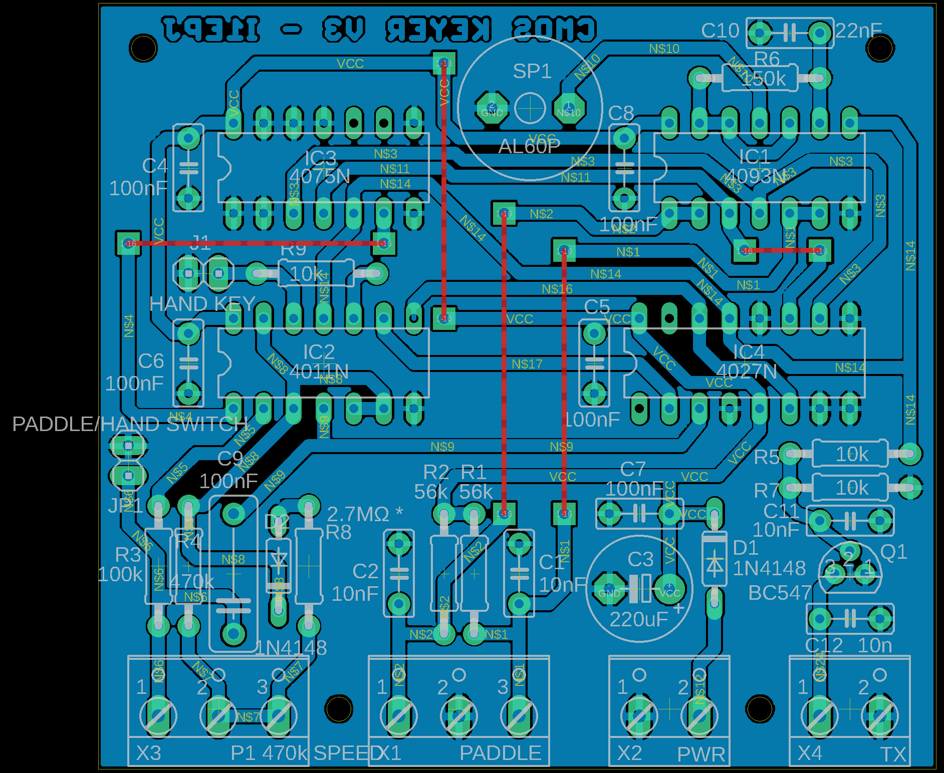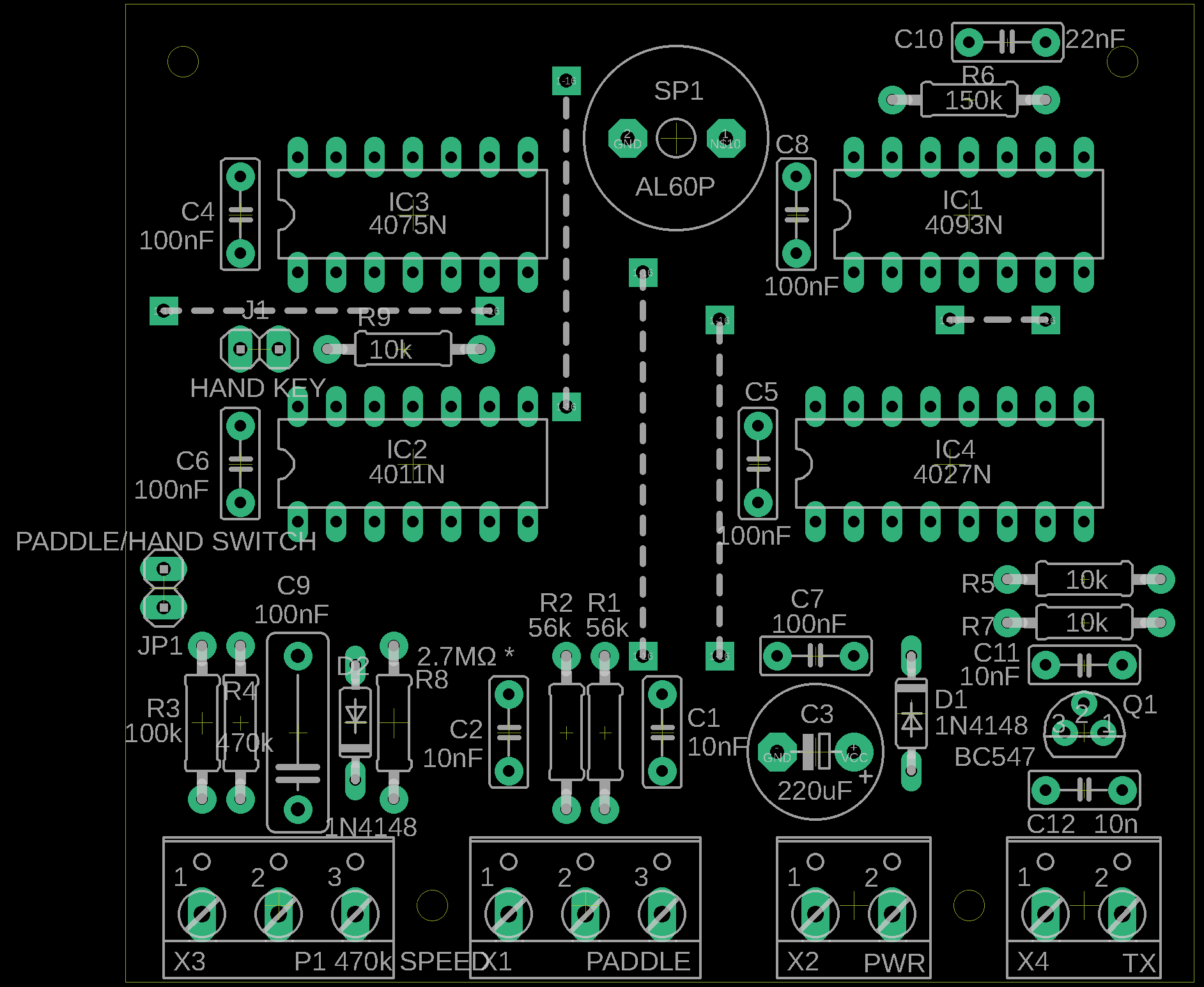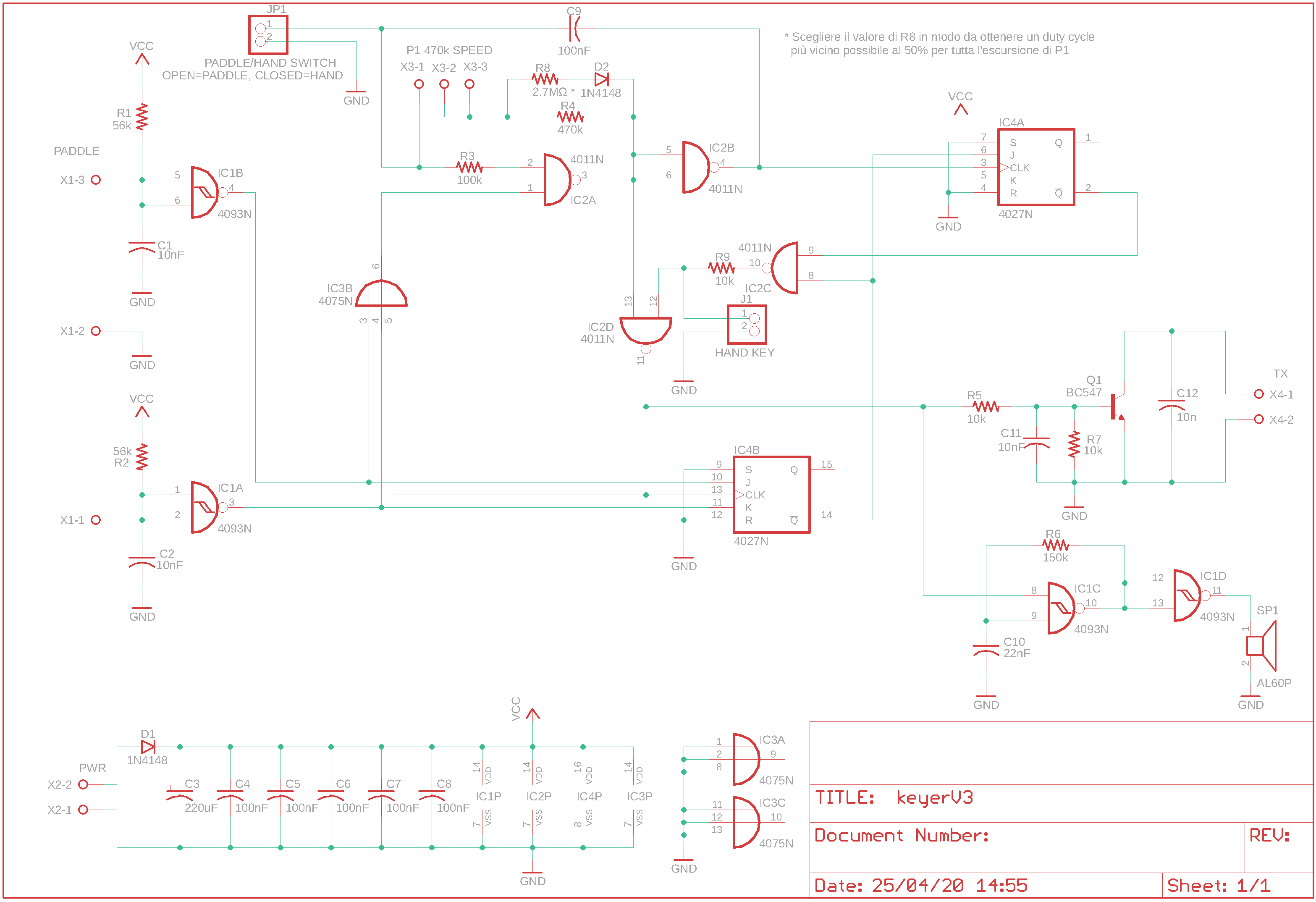 Poiché però non si è ancora trovato il modo di attivare il sidetone del Debeg, come descritto qui, si è rimaneggiato (leggi: papocchiato) il circuito in modo da attivare il sidetone interno al keyer anche utilizzando un tasto verticale. Le modifiche sono state realizzate tenendo conto soprattutto della loro semplicità, anche a scapito delle prestazioni, in modo da poterle realizzare sull'esemplare già costruito. Alla fine della fiera il tutto ha richiesto un resistore, un interruttore, qualche pezzo di filo e il taglio di una pista. Già che si stava a far modifiche, sono state incorporate anche quelle relative al tentativo di rendere il duty cycle dell'oscillatore più vicino al 50% (componenti richiesti: un resistore ed un diodo) e sono stati aggiornati schema e circuito stampato, ottenendo così la versione 3 del keyer, che si può scaricare qui in formato Eagle 9. Chi fosse solo curioso, ma non interessato, può vedere ai link che seguono schema, circuito stampato e disposizione componenti in formato PNG.